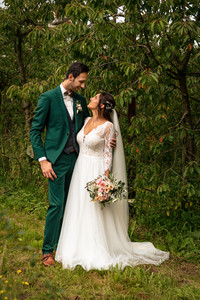 De 'first look' was in de tuin van de Heische Hoeve tussen de strak gerangschikte bomen. Wat een mooi moment toen Angelo zich omdraaide en daar zijn bruid zag staan. Tijdens de fotoreportage met het bruidspaar spatte de liefde er van af. Zo'n mooi bruidspaar!